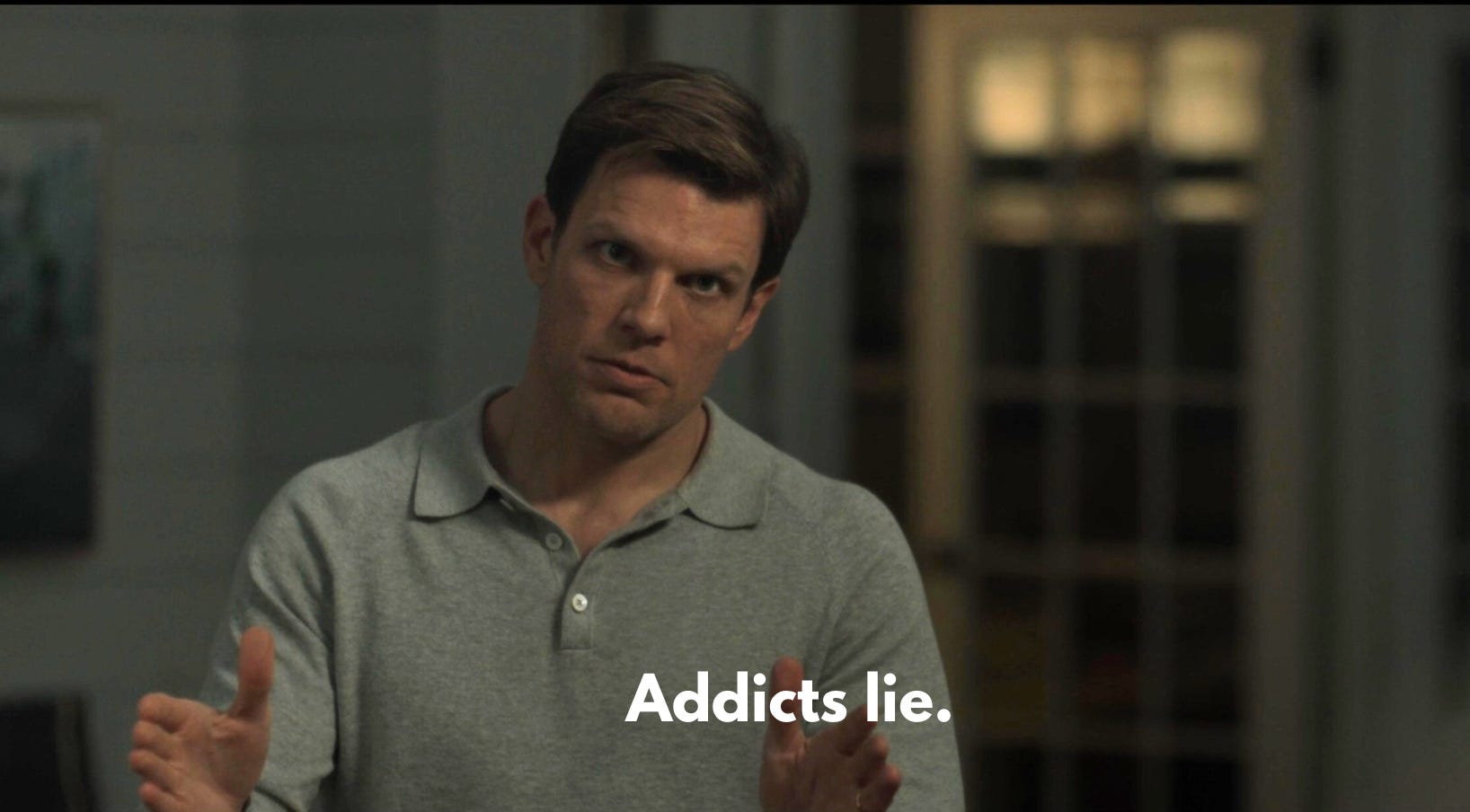 I’m only looking at about a minute of screentime, so I’ve written out the dialogue (I’m hoping to figure out a legal-ish way to embed clips—if you know of one, please let me know). The interaction feels very real; some version of this confrontation has played out countless times among people in recovery and their loved ones.